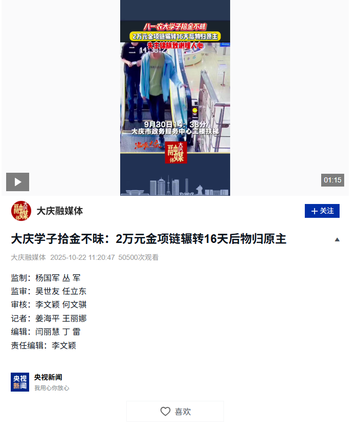 【央视新闻客户端】大庆学子拾金不昧:2万元金项链辗转16天后物归原主