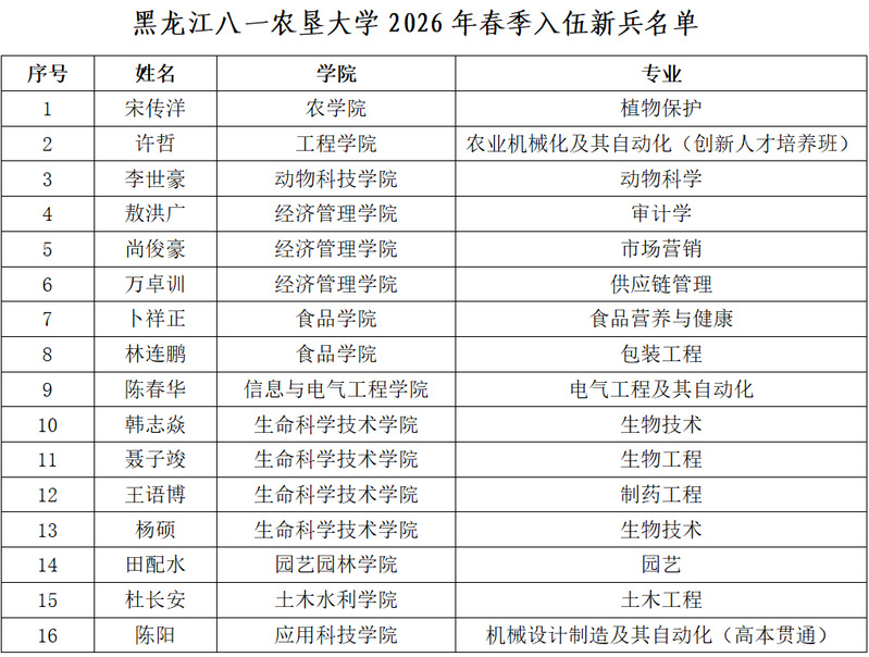 春潮澎湃启新程,热血青年赴军营。3月15日下午,学校在八一广场举行2026年春季新兵入伍欢送仪式,热烈欢送16名优秀学子身披戎装、投身国防,开启军旅生涯新篇章。学校党委副书记、工会主席高宏出席欢送仪式。武装部负责人,相关学院副书记、辅导员及国防教育协会成员代表共同见证这一光荣时刻。