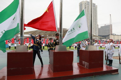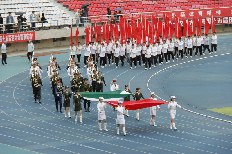 解宗军宣布我校第四十五届田径运动会开幕。开幕式在庄严的国歌声和悠扬的校歌声中正式开始,国旗、校旗在田径场上空随风飘扬。