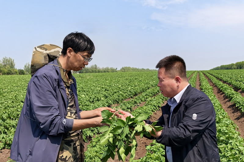 为此,金光辉2025年分两次远赴新疆,一共驻守了13天。据他回忆,要从哈尔滨坐飞机到北京,从北京转机到乌鲁木齐,再从乌鲁木齐转机到叶尔羌机场,最后才能坐车到喀什地区的泽普县,那里有他需要开展技术服务的企业。第一次是6月6日至13日,金光辉除来到新疆阿拉尔市和喀什地区,还到达了远届淀粉公司原料薯生产基地—中国西极“乌恰县”,边境对面是吉尔吉斯斯坦国,距离大庆有万里之遥。第二次是8月24日至28日,不仅来到喀什的泽普县和乌恰县,还到达阿克苏地区、伊利昭苏县。金老师的主要工作:一是与当地企业和政府机构洽谈合作。二是对引种到当地的垦薯系列和“红粉佳人”马铃薯品种进行生产调研和技术服务。