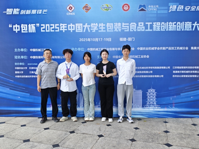 近日,“中包杯”2025年中国大学生包装与食品工程创新创意大赛在福建省厦门市落下帷幕,我校闯入全国总决赛的两支参赛队伍喜获佳绩。其中由陈永平、王士彬和杨竣云组成的“蓝海先锋队”团队荣获一等奖;崔惜缘、满天玉和吴欣月组成的“月满缘 Moon Xing Yuan SealPro”团队荣获三等奖。