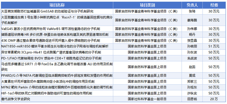 8月27日,国家自然科学基金和国家社科基金项目评审结果陆续公布。我校共获批14项国家基金项目。其中国家自然科学基金项目立项13项,直接经费总额551万元,实现项目经费双增长。项目覆盖农学基础与作物学、植物保护学、兽医学等基础学科前沿领域。国家社科基金一般项目立项1项,获批经费20万元。今年12月,2025年度黑龙江省自然科学基金拟资助项目公示。我校获批省自然科学基金项目44项,获批经费535万元,立项数量和获批经费均创历史新高。其中,校(院)企合作项目29项,数量排全省第2位;青年C类项目10项,数量排全省第8位;青年A类项目和重点项目各1项;青年B类项目3项。国家基金项目和省自然基金项目的获批,为我校“十四五”科研工作任务圆满收官和“十五五”高质量发展注入了强劲动力。