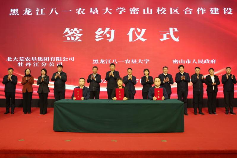 12月27日上午,由中共鸡西市委、鸡西市人民政府主办,鸡西市委组织部、鸡西市教育局、密山市人民政府承办,我校、北大荒集团牡丹江分公司协办的合作建设八一农大密山校区签约仪式在鸡西市专家服务中心举行。鸡西市委书记孙成坤、省教育厅副厅长李石、北大荒农垦集团副总经理任淑兰、学校党委书记解宗军出席并讲话。我校校长李翠霞、密山市人民政府市长王士强、北大荒农垦集团牡丹江分公司总经理于海军分别代表校、地、垦三方签署战略合作办学框架协议。此次签约是学校践行习近平总书记关于东北全面振兴、兴边富民重要论述的具体行动,是传承北大荒精神、深化校地企融合的战略举措,标志着学校在服务国家粮食安全、推动现代农业高质量发展、助力边疆振兴的道路上迈出了崭新步伐。