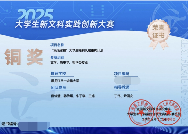 11月30日,由全国新文科教育研究中心主办的2025大学生新文科实践创新大赛全国决赛在西安交通大学圆满落幕,本届赛事吸引了全国31个省423所高校的16万余名学生参赛。我校人文社会科学学院学生薛佳慧、韩传超、朱子琪、王旭组成团队参赛,凭借项目《“乐活豕福”大学生福利认知重构计划》获国赛铜奖。