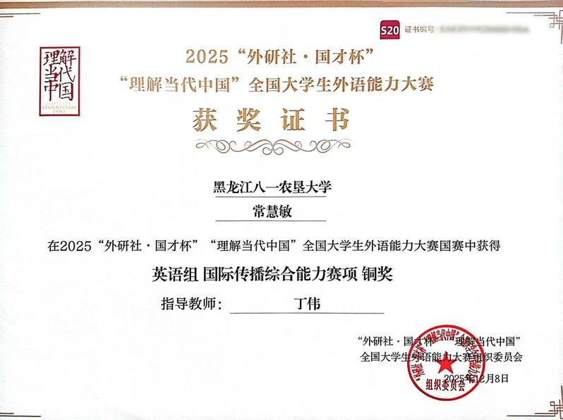 11月22日,由北京外国语大学主办的2025“外研社·国才杯”“理解当代中国”全国大学生外语能力大赛举行。本届大赛1300余所院校参赛,我校人文社会科学学院学生常慧敏在英语组国际传播综合能力赛项和英语组笔译赛项分别获得1项铜奖。