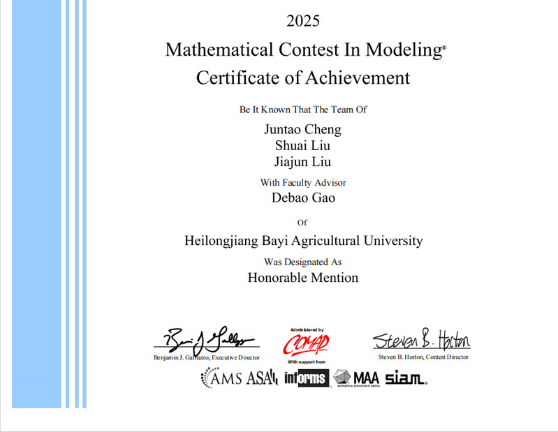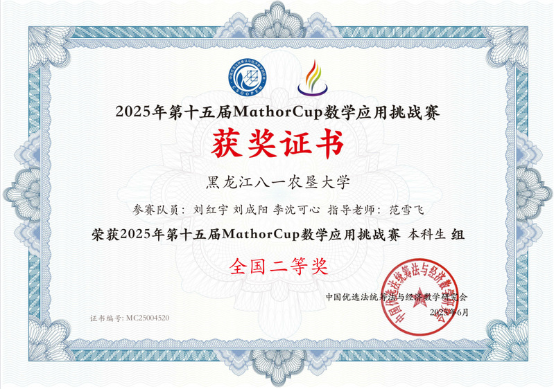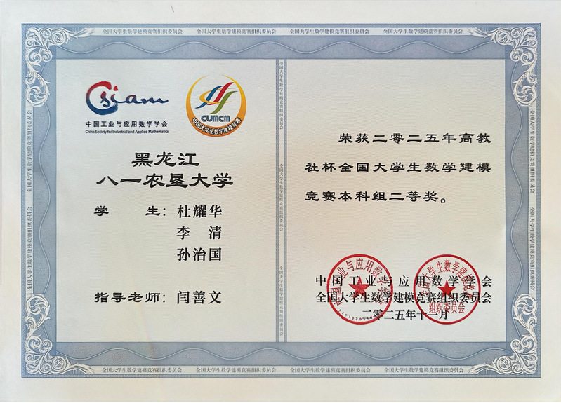 9月4日至7日,由中国工业与应用数学学会主办的2025年全国大学生数学建模竞赛举行。本届赛事吸引全球1837所院校的68311支队伍参赛。我校学生杜耀华、李清、孙治国组成的参赛团队荣获全国二等奖。
