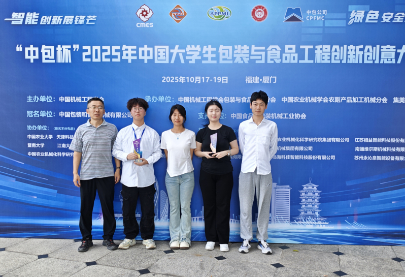 10月19日,由中国机械工程学会主办的“中包杯”2025年中国大学生包装与食品工程创新创意大赛在福建省厦门市落下帷幕。本届大赛共吸引来自106所高校的1409名学生踊跃参与。我校陈永平、王士彬和杨竣云组成的“蓝海先锋队”团队荣获一等奖。崔惜缘、满天玉和吴欣月组成的“月满缘Moon Xing Yuan SealPro”团队荣获三等奖。