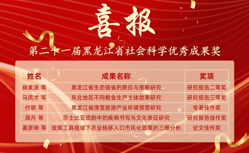 近日,第二十一届黑龙江省社会科学优秀成果奖评选结果正式揭晓。我校申报的社科研究成果再创佳绩,5项成果脱颖而出,荣获二等奖1项、三等奖1项、佳作奖3项,涵盖经济管理、文化传承、区域发展等多个研究方向,充分展现我校哲学社会科学研究的持续创新活力与扎实学术积累。