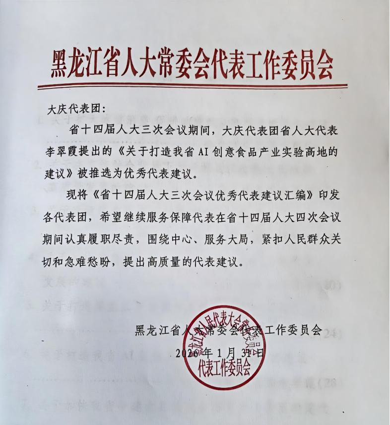 1月30日至2月3日,黑龙江省第十四届人民代表大会第四次会议和黑龙江省政协第十三届委员会第四次会议在哈尔滨召开。我校校长、省人大代表李翠霞在省十四届人大三次会议上提交的《关于打造我省AI创意食品产业实验高地的建议》,被省人大常委会代表工作委员会推选为优秀代表建议,进一步彰显了我校代表立足专业优势、服务地方发展的责任担当。