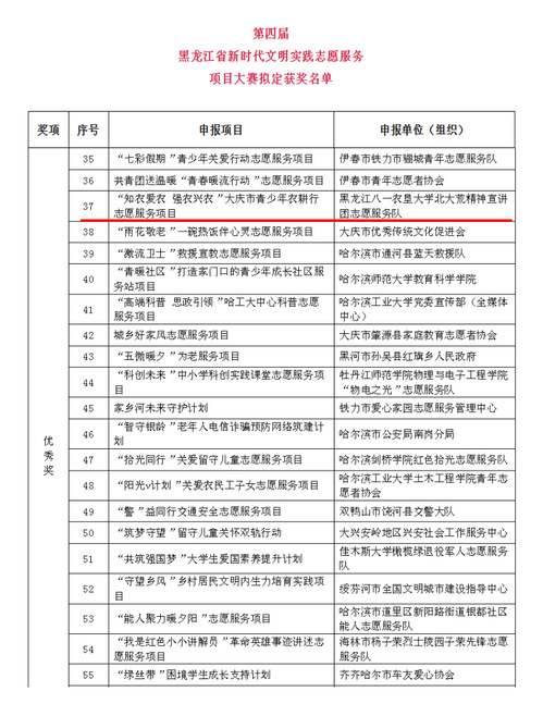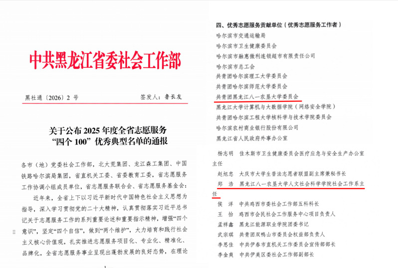 近日,在省委社会工作部、省委宣传部(省文明办)组织的“第四届黑龙江省新时代文明实践志愿服务项目大赛”,以及省委社会工作部开展的2025年度全省志愿服务“四个100”优秀典型学习宣传活动中,我校捷报频传,共斩获三项荣誉。在此次活动中,校团委获“优秀志愿服务贡献单位”,人文社会科学学院社会工作系主任郑浩同志获评“优秀志愿服务工作者”称号,北大荒精神宣讲团志愿服务队开展的“知农爱农 强农兴农”大庆市青少年农耕行志愿服务项目获第四届黑龙江省新时代文明实践志愿服务项目大赛优秀奖。