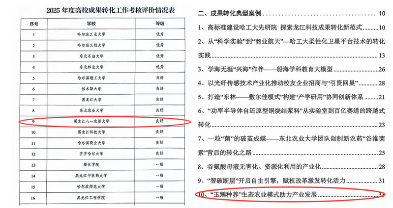 3月29日,省教育厅深化高等院校科技成果转化体制机制改革工作推进会传来捷报:在2025年度全省高校成果转化工作考核评价中,我校凭借扎实的工作成效获评“良好”等级,位列全省高校第九名;自主研发的“玉鹅种养”生态农业模式,成功入选全省十大成果转化典型案例,实现排名与典型案例“双突破”。
