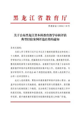 近日,黑龙江省教育厅公布了黑龙江省本科教育教学审核评估典型经验案例评选结果。在评选出的40个典型经验案例中,我校《以评促改强内涵,强农育人谱篇章》《围绕应用型定位 聚焦内涵式建设 奋力谱写本科教育教学高质量发展新篇章》两个案例成功入选。