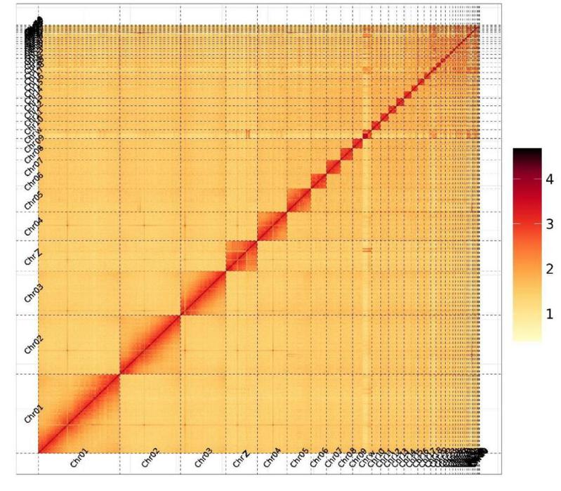 图2 籽鹅基因组组装的Hi-C图。x轴和y轴代表染色体,颜色强度表示基因组区域间的相互作用频率。