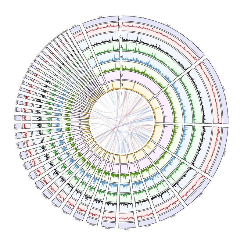 图4 籽鹅基因组中染色体的Circos图谱。从外向内依次显示:(a) 染色体分布,(b) GC含量密度,(c) 基因密度,(d) mRNA密度,(e) 外显子密度,(f) CDS密度,(g) lncRNA密度,(h) 重复序列密度,图b-h均以300kb分辨率呈现;(I)染色体中同源基因的共线性分布。