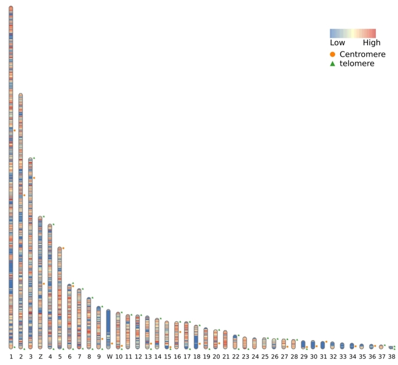 图3 籽鹅染色体上端粒与着丝粒的分布。数字表示染色体编号。绿色三角形代表端粒,橙色圆圈代表着丝粒。从蓝色(低)到红色(高)的渐变色表示相对信号强度。