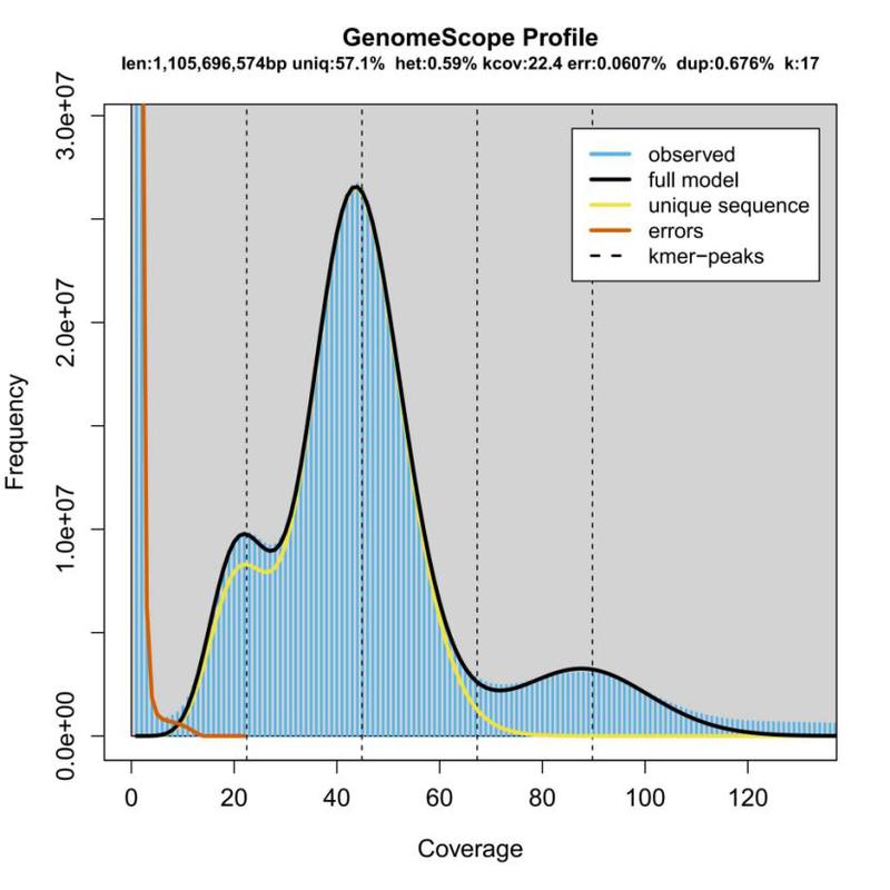 图1 籽鹅基因组的17K-mer频率分布图。x轴显示K-mer深度,y轴表示K-mer数量。